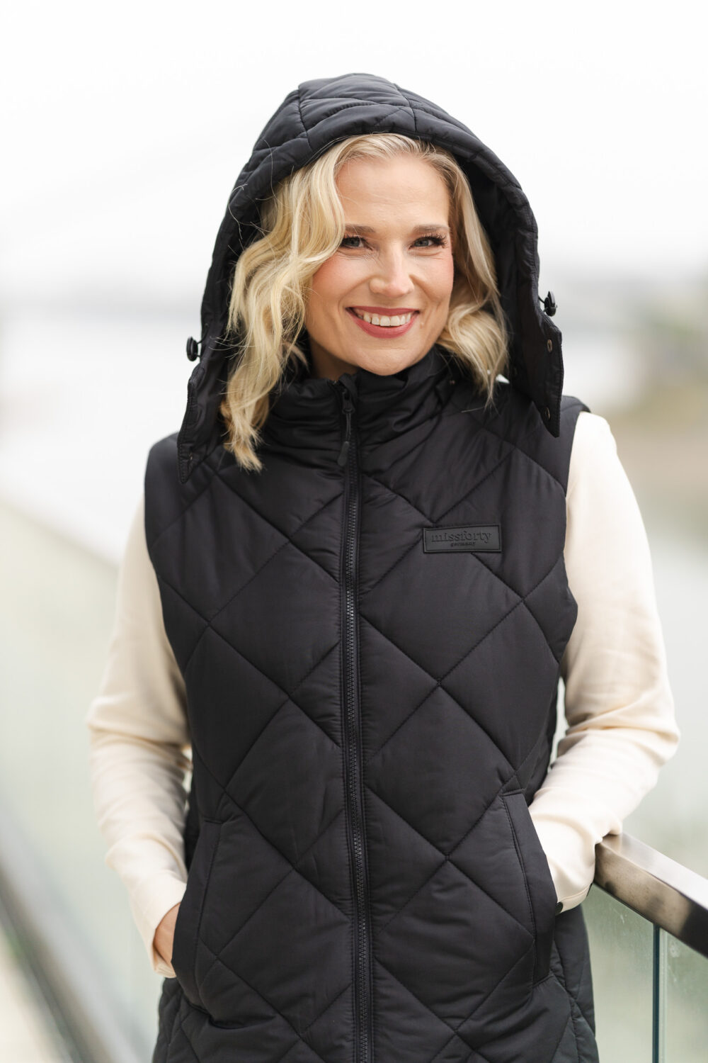 Mit einer abnehmbaren Kapuze, die über Druckknöpfe und einen Kordelverschluss verfügt, bietet die Weste maximale Flexibilität für verschiedene Wetterlagen. Der durchgehende Reißverschluss sorgt dafür, dass sie sich leicht an- und ausziehen lässt, während die seitlichen Eingriffstaschen praktischen Stauraum und Komfort bieten. Ein seitlicher Patch mit dem missforty germany Logo setzt ein dezentes Marken-Statement und unterstreicht die hohe Qualität.